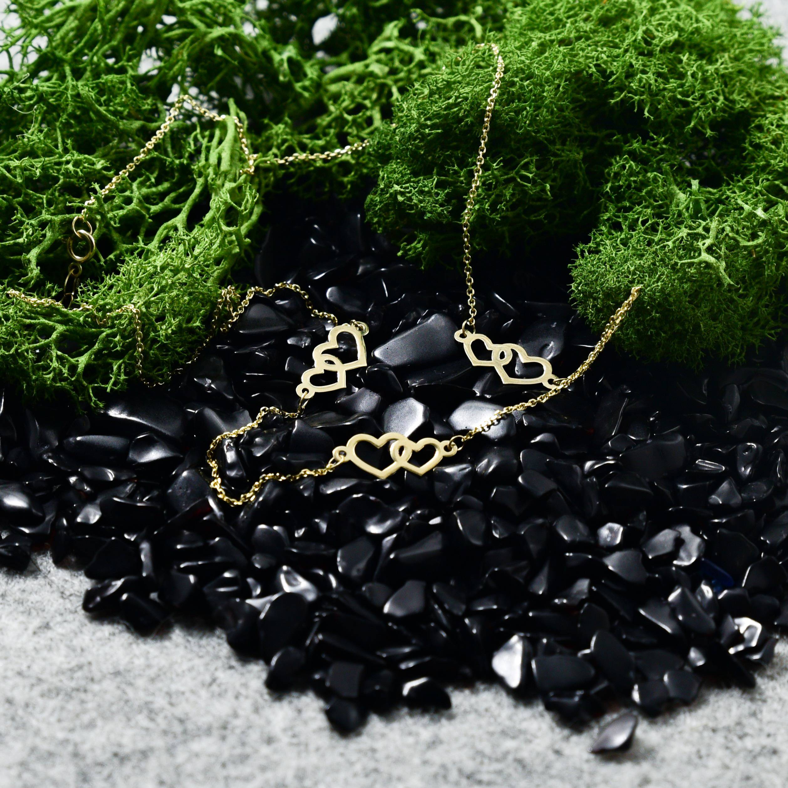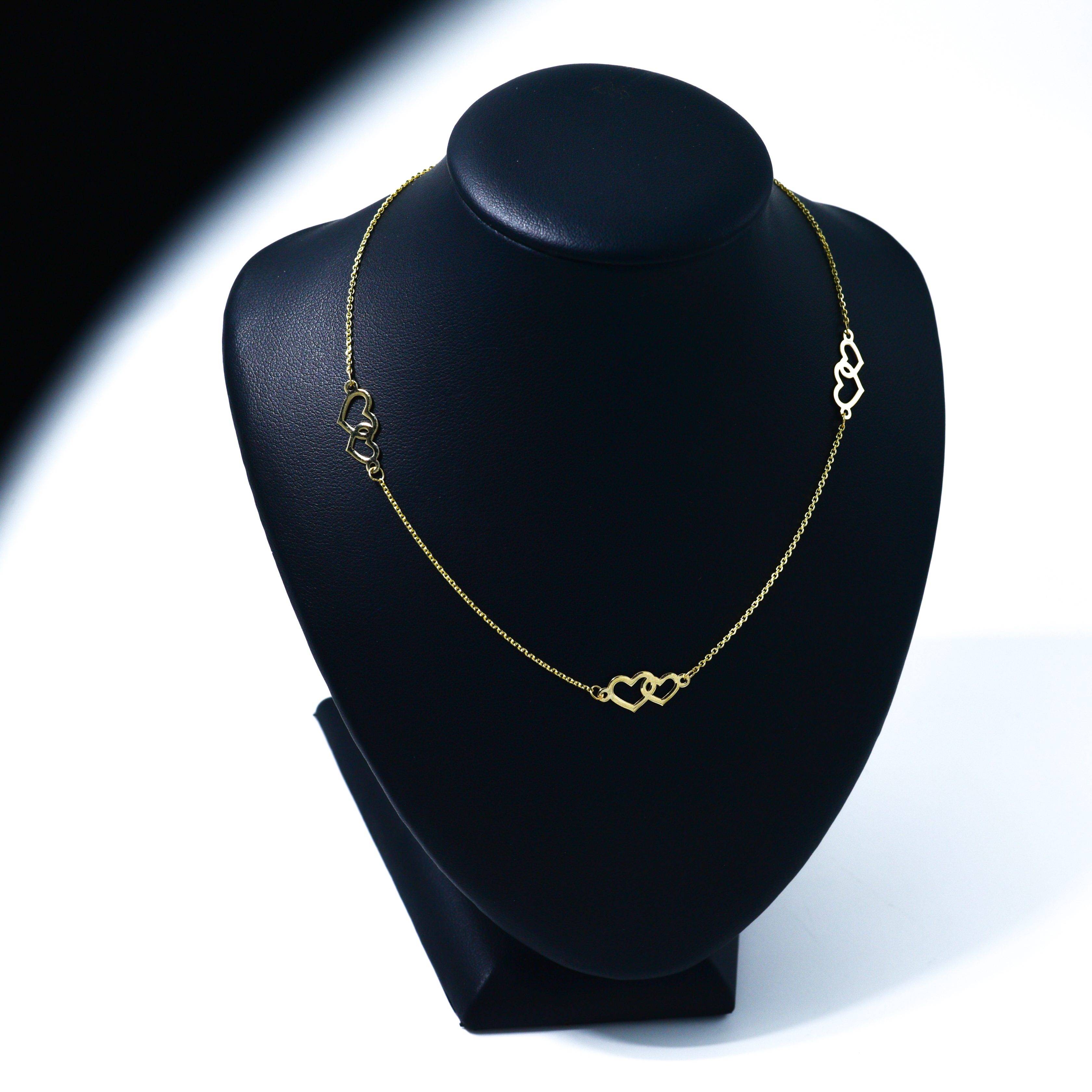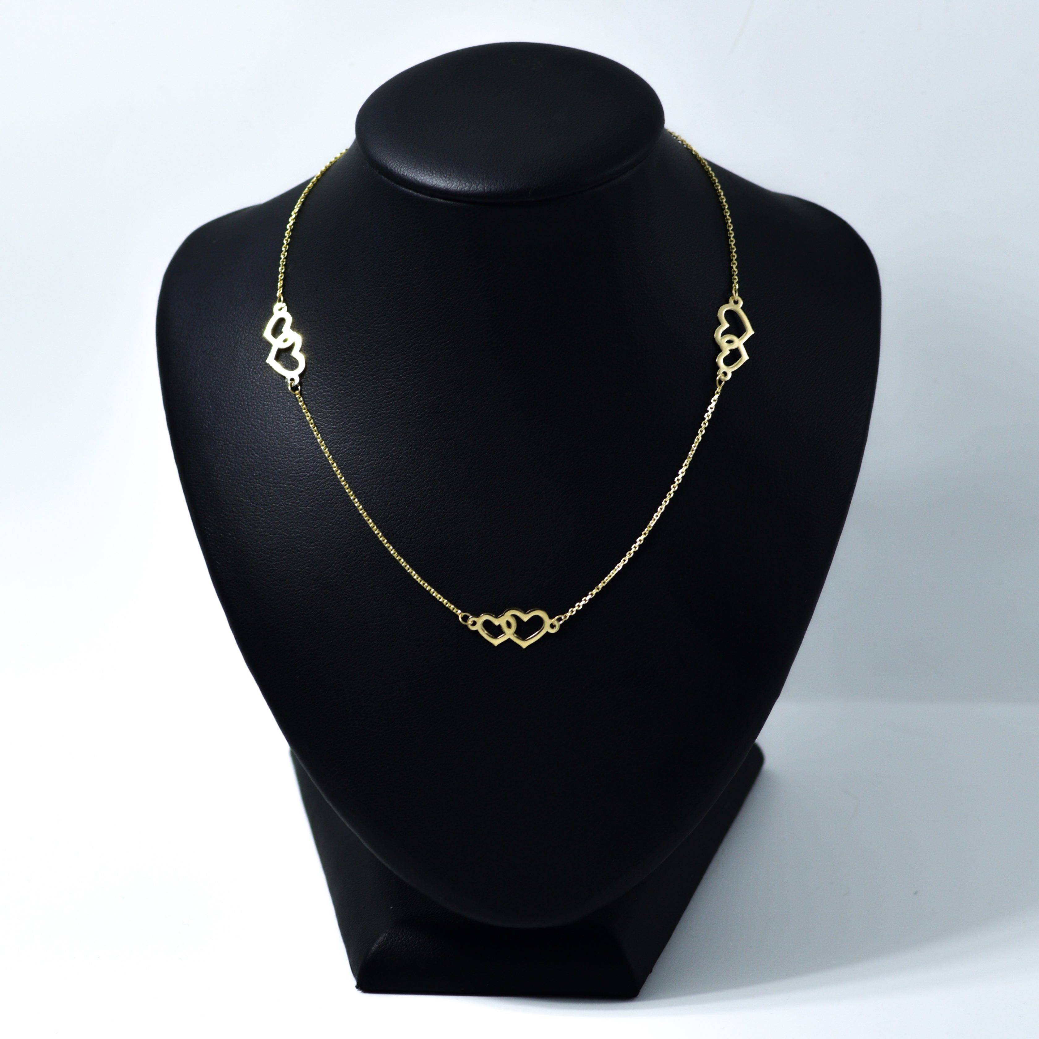Acest lanț delicat din aur galben de 14K este o bijuterie rafinată, perfectă pentru femeile care iubesc accesoriile subtile, dar elegante. Designul său special include 3 pandantive inimioară decupate, fiecare având 15 mm lungime și 7 mm lățime, creând un simbol discret al iubirii și armoniei.