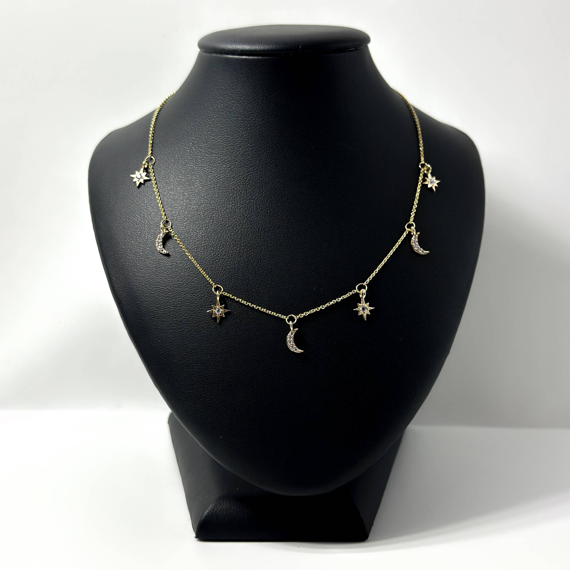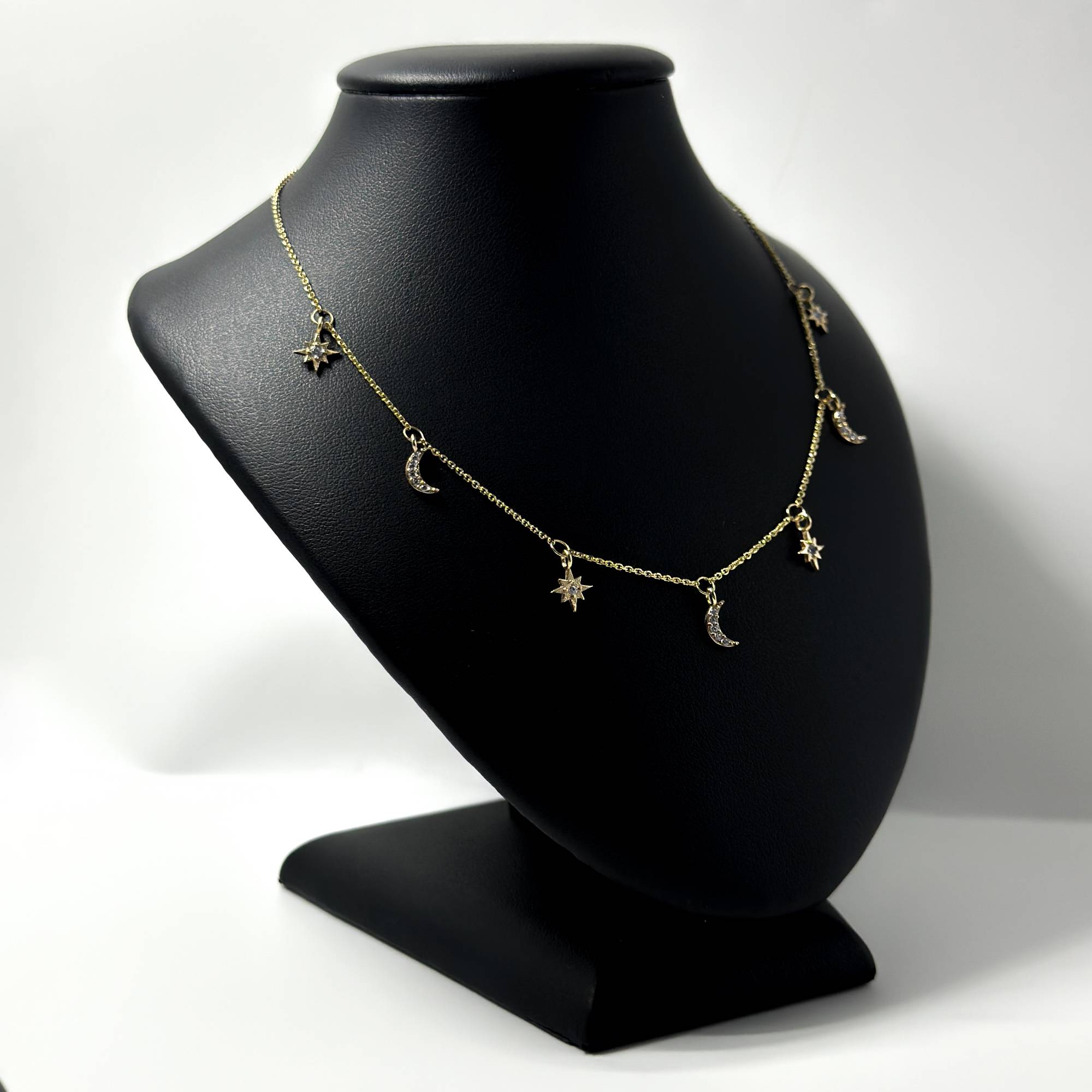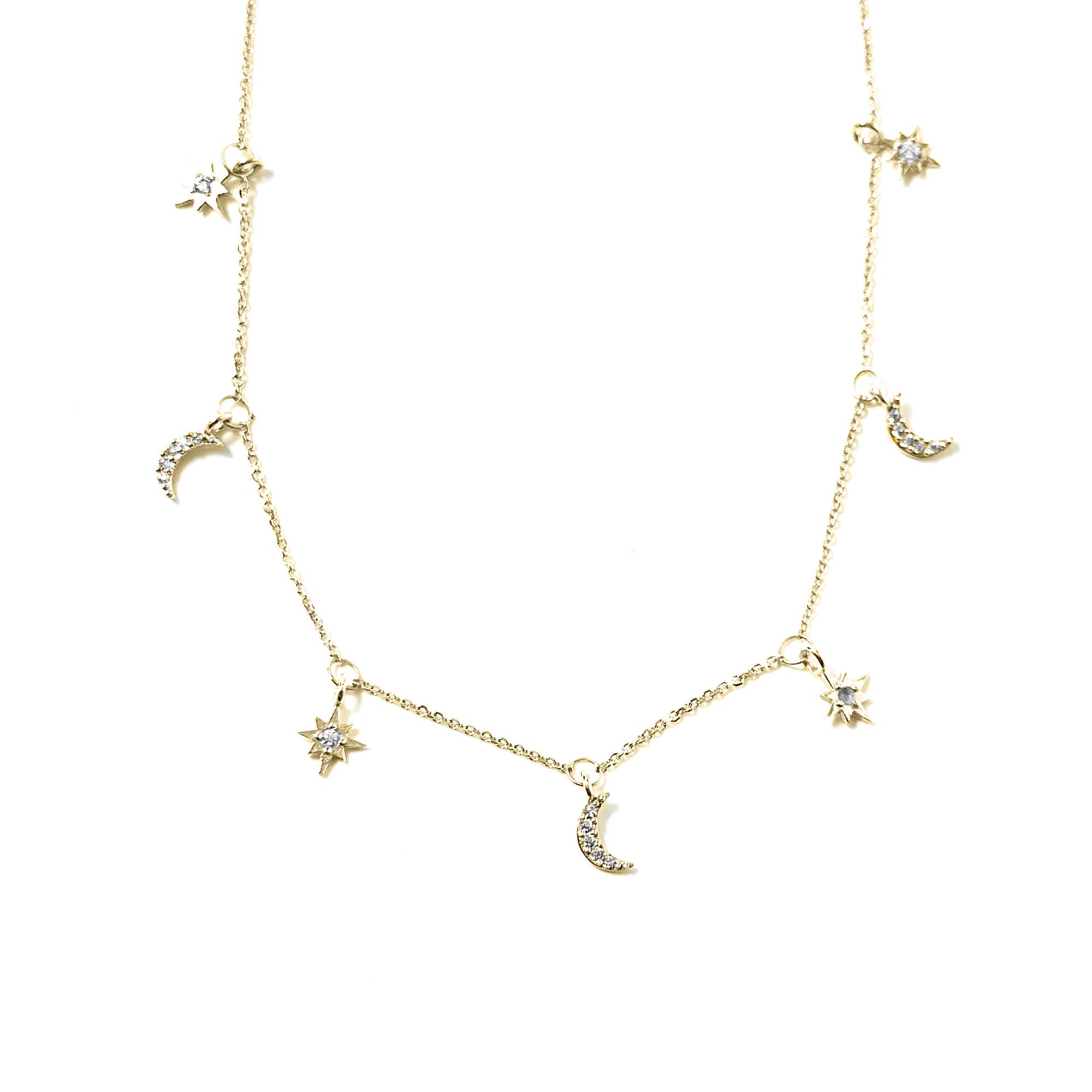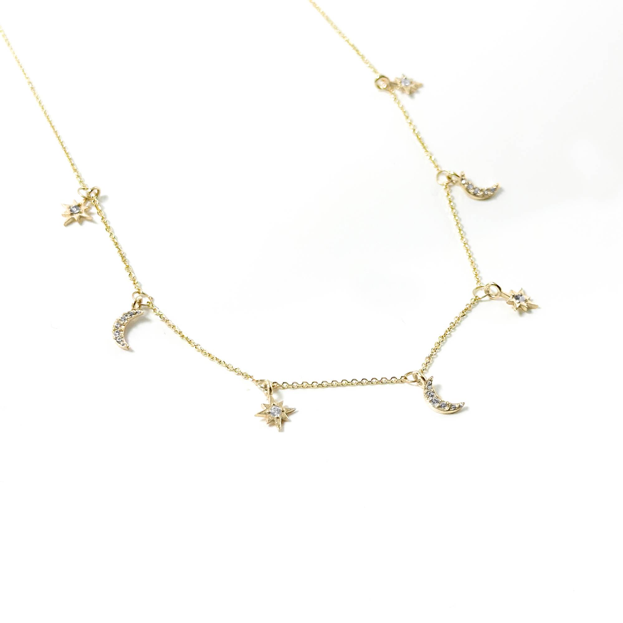 Inspirat de frumusețea cerului, acest lanțisor din aur galben 14K aduce un plus de eleganță și farmec fiecărei ținute. Bijuteria este decorată cu pandantive delicate în formă de lună și soare, fiecare având dimensiuni între 5 și 6 mm. Pietrele de zirconiu ce împodobesc pandantivele adaugă o notă subtilă de strălucire, transformând acest lanțisor într-o piesă cu adevărat specială.
